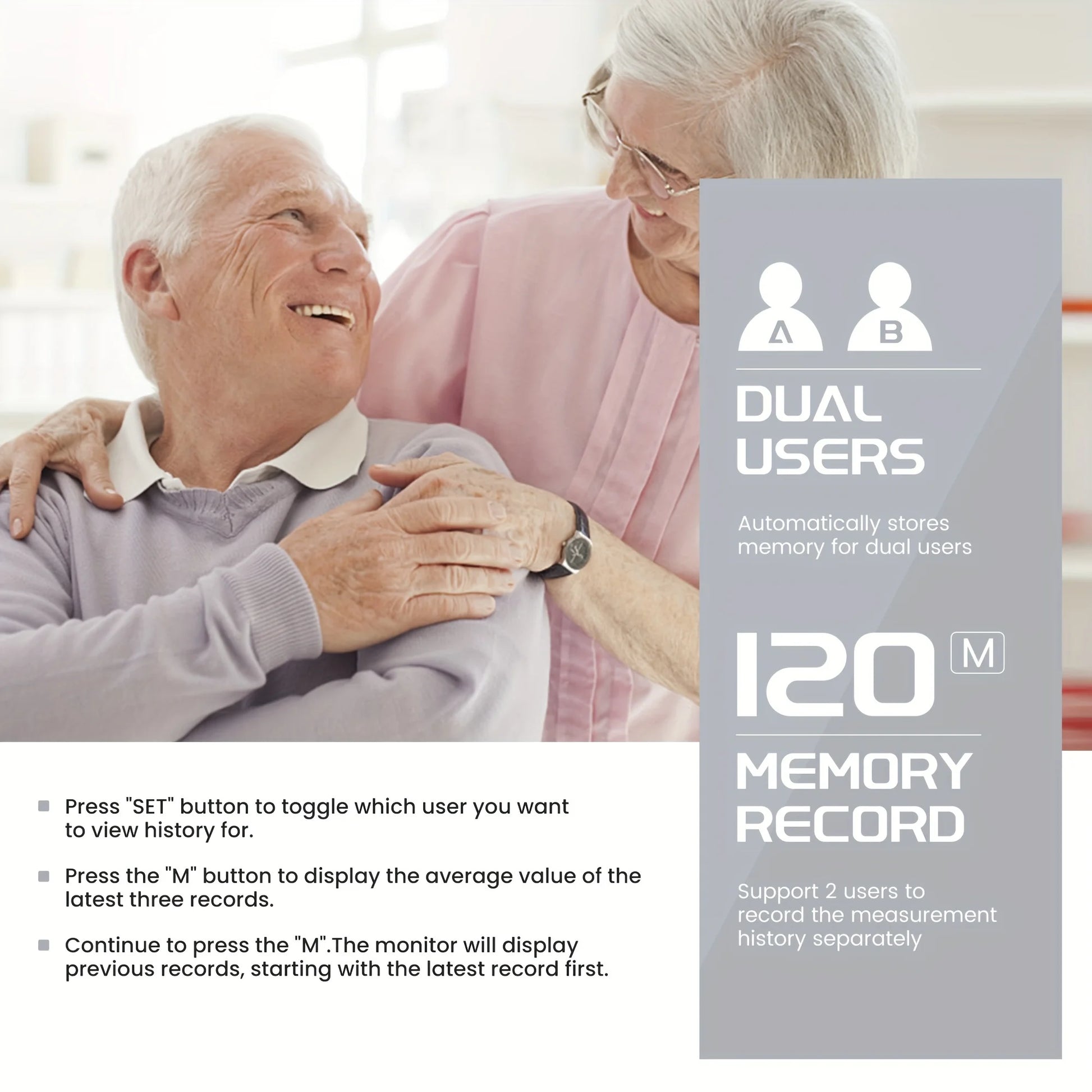 - Memory for 120 readings in 2 groups with date and time so you can easily monitor trends over time and compare sessions.